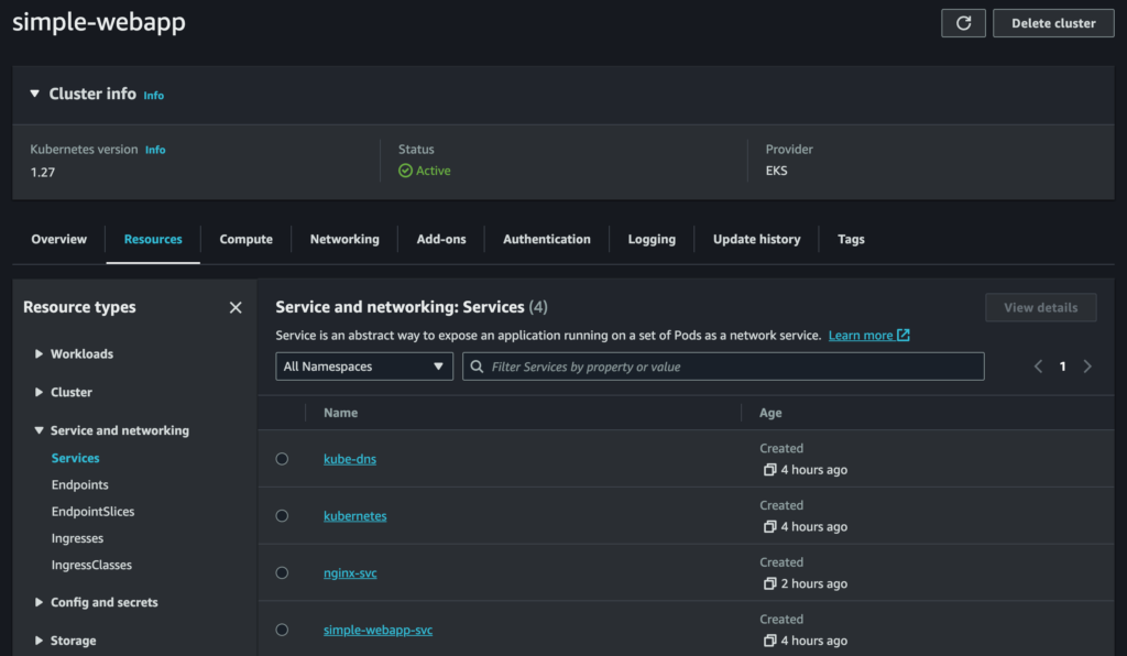 The web-based EKS Management Console isn’t as pretty as the minikube dashboard, and oddly it seems to have some missing information (I couldn’t find the nginx ConfigMap in there, for example) but is still useful for obtaining information. For example, we can see our Deployments, Services and Nodes: