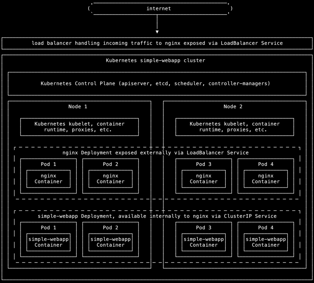 Our goal is to create a Kubernetes cluster serving the output of simple-webapp via nginx. simple-webapp is a simple Python app I wrote for these kinds of projects, which outputs a basic web page as proof of concept. In a real production environment, this would be a full-blown web application of some kind.
