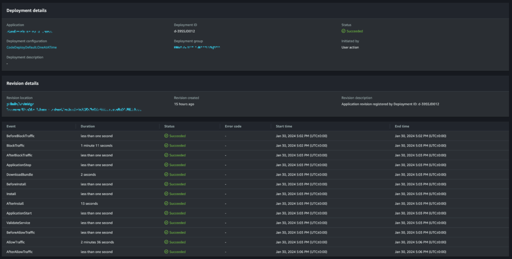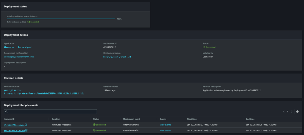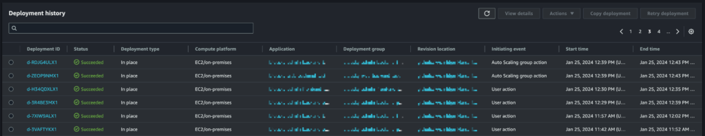 As part of the setup process, CodeDeploy automatically installs an auto-scaling lifecycle event hook into the auto-scaling group. This means that when the auto-scaling group scales out, CodeDeploy automatically runs the latest successful deployment on the new EC2 instances which have been launched, thus ensuring the whole group is up to date with the latest successful deployment at all times. These will show in CodeDeploy with the initiating event as “Auto Scaling group action”, as opposed to “User action” when the deployment has been triggered from GitHub Actions.