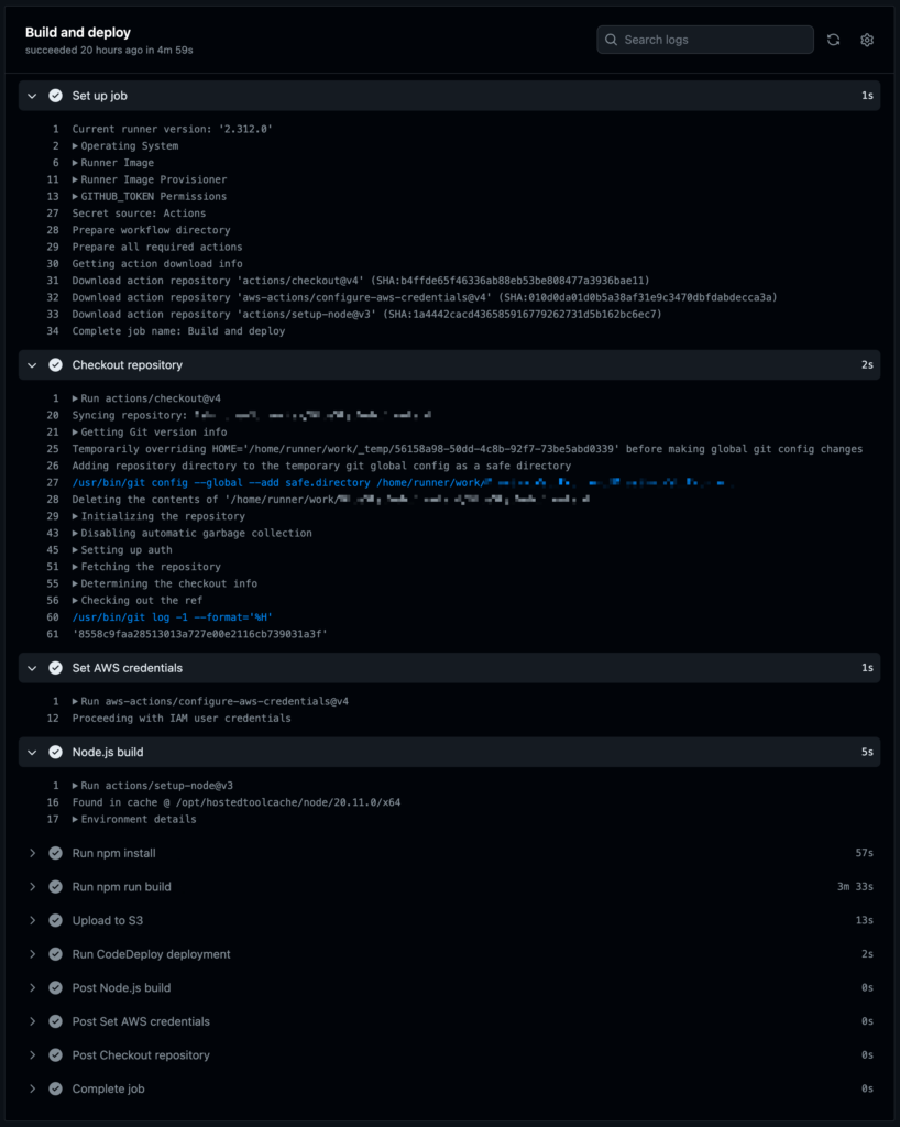 The jobs: section defines the job to build and deploy. It spins up an Ubuntu VM as a “runner” on which to run the job, then checks out the repository, then sets the AWS credentials as set up previously. It then sets up a Node.js environment and builds the distribution files.